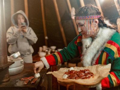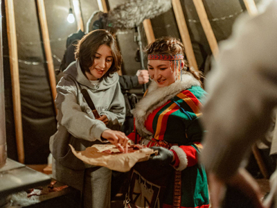 Садись на снегоход и отправляйся на настоящий чумовой ужин — настоящий званный пир, созданный по всем канонам и традициям народов Севера. Блюда из оленины, строганина из сига и варенья из местных ягод ждут тебя в этой локации. Необычная встреча пройдет в чуме — утеплённом переносном жилище в виде шатра.