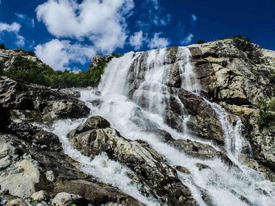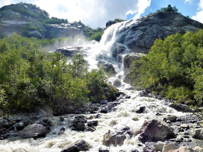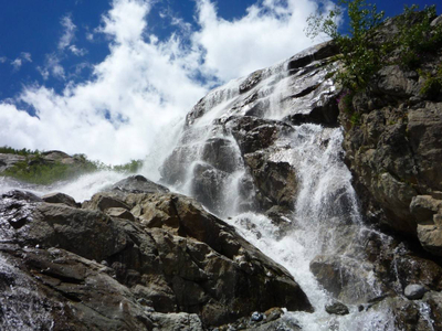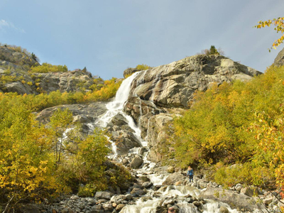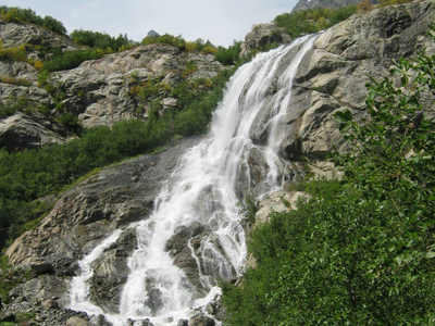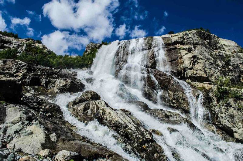 Один из самых больших и эффектных водопадов в Домбае. Входит в состав Тебердинского заповедника. Его высота — более 25 метров. Алибекский водопад появился в XX веке. Ещё в 1930-е годы водопада не было, а скальчатый уступ был накрыт языком Алибекского ледника, который каждый год отступает вверх на метр-полтора. Удивительные округлые скалы, с которых низвергается поток воды называются бараньими лбами. Свою форму они приобрели благодаря движению ледника.