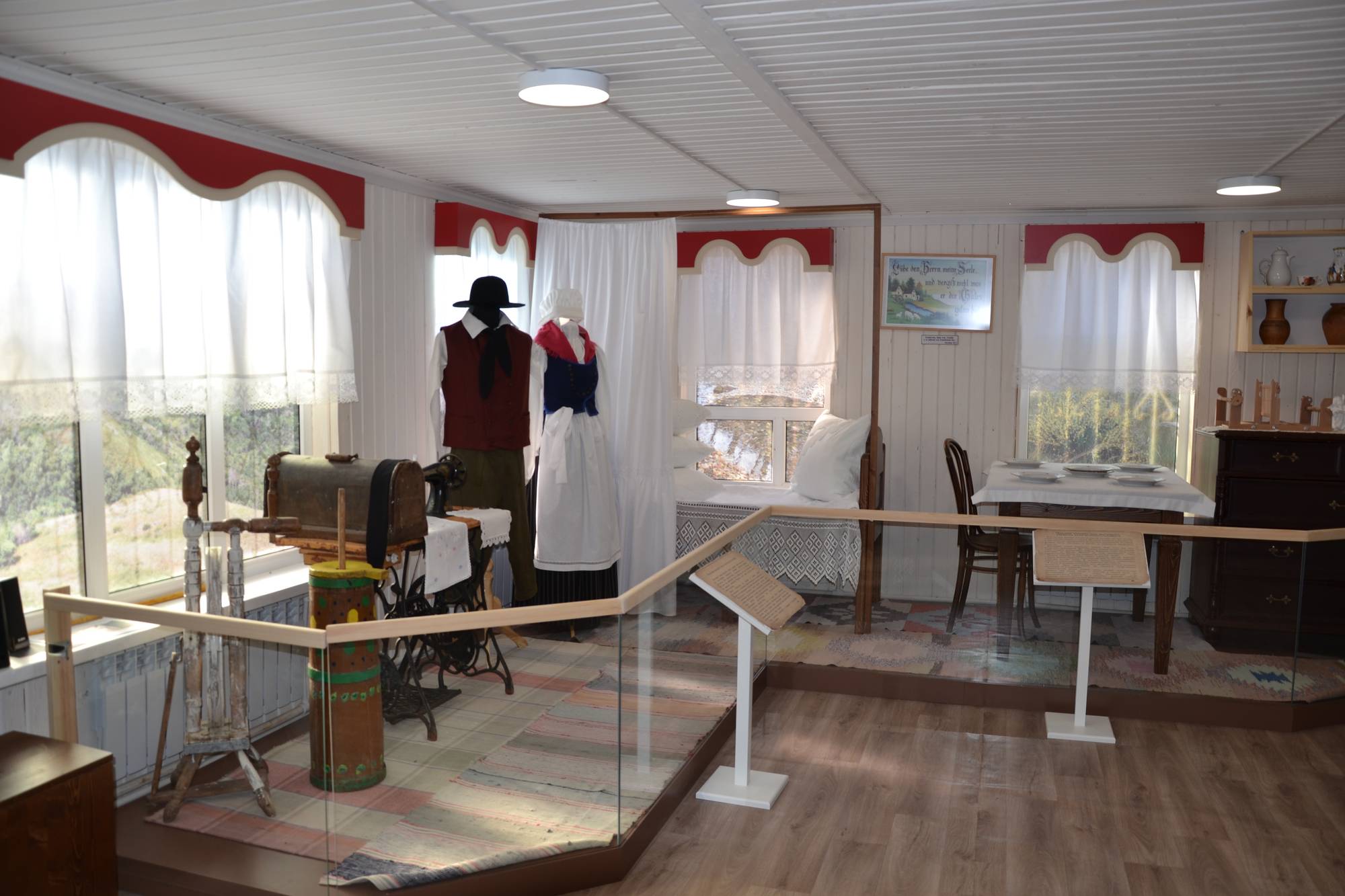Экспозиция музея последовательно знакомит с заселением, освоением и развитием края переселенцами из Западной Европы, особенностями их жизни и организации быта. Среди экспонатов — прялка, маслобойка, швейная машинка, коромысло. Каждая вещь имеет свою историю.
