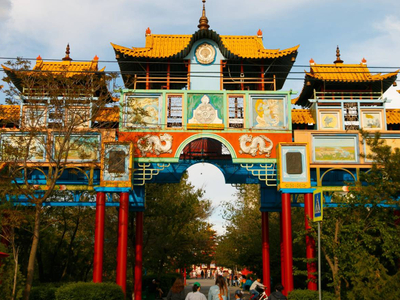 Самая узнаваемая достопримечательность Элисты. Пятнадцати-метровая арка золотистого цвета, поддерживаемая красными колоннами, несет в себе сакральный смысл — это символ священного порога, переступив через который, человек может духовно очиститься. За Золотыми воротами идет белокаменная дорожка, символизирующая путь добродетели. Пройдя под аркой, верующие начинают ощущать уверенность и силу.