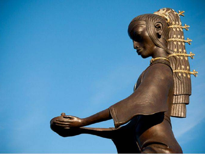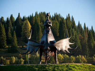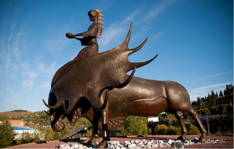 Скульптурная композиция представляет собой лося, на котором восседает девушка с чашей. Лось символизирует богатую историю края, а девушка – связь прошлого и настоящего. В чаше горит «вечный огонь», а костюм девушки украшен золотой амальгамой.