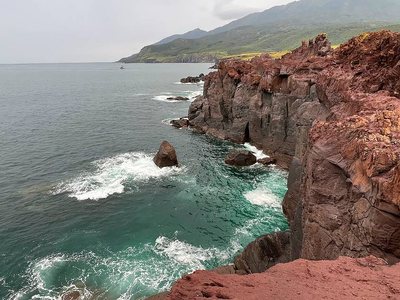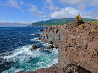 Базальтовое лавовое плато на острове Итуруп в Курильском архипелаге, образованное из застывшей лавы вулкана Богдан Хмельницкий, где вода и ветер создали причудливые остроконечные скалы, формируя инопланетный пейзаж.