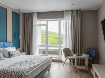 Всего 150 метров отделяют отель от морского побережья живописной бухты Лазурная (Шамора) с благоустроенным песчаным пляжем.