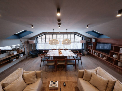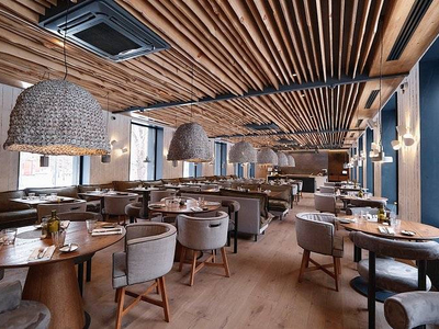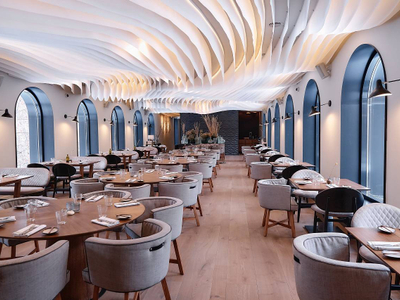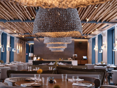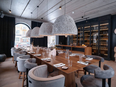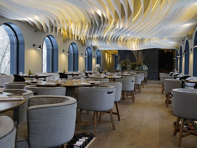 Рыбный ресторан, расположенный в здании бывшей оранжереи, с панорамными окнами и интерьером, вдохновленным природными текстурами.