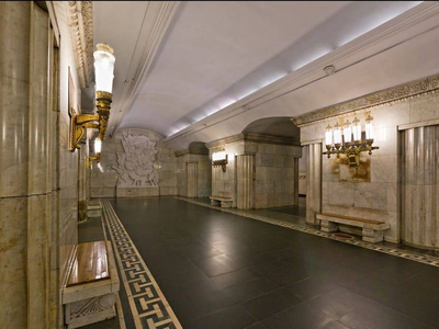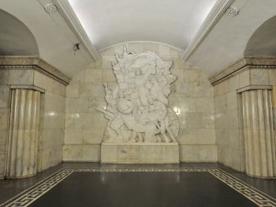 Оформление станции посвящено военно-исторической теме. Пилоны станции облицованы белым мрамором, украшены по углам полуколоннами. Пол выложен чёрным мрамором с орнаментом из белого и красного мрамора по боковым сторонам зала. Путевые стены облицованы белой керамической плиткой, внизу — чёрным мрамором. Круглый наземный вестибюль отделан чёрным мрамором в основании и украшен четырьмя медальонами с изображениями исторических событий и указаниями дат: 1612, 1812, 1917 и 1945. Мозаичный фриз круглого эскалаторного зала представляет собой повторяющиеся изображения ордена «Победа».