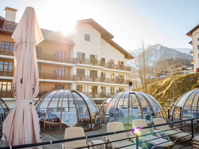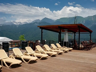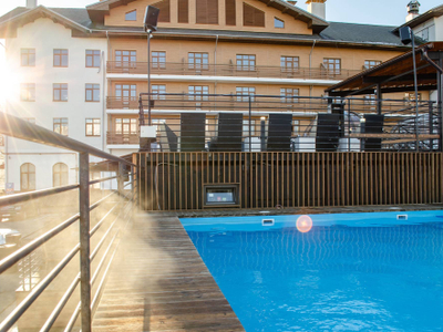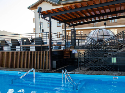 Термально-развлекательный комплекс в горах. Открытый бассейн с подогревом, сауна и гастробар на панорамной смотровой площадке.