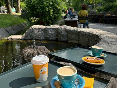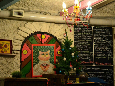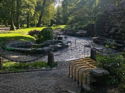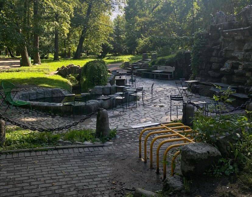 Микрокофейня в старинном гроте Александровского парка на Горьковской. Снаружи и внутри кофейня напоминает жилище сказочного хоббита: увитый зеленью арочный вход, каменные своды, цветные лампочки. Внутри всего несколько столиков, летом гости устраиваются на террасе у пруда.